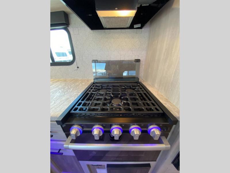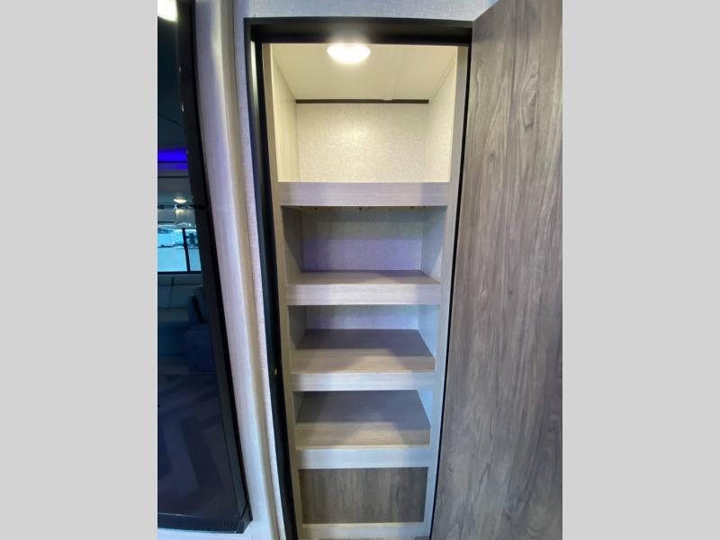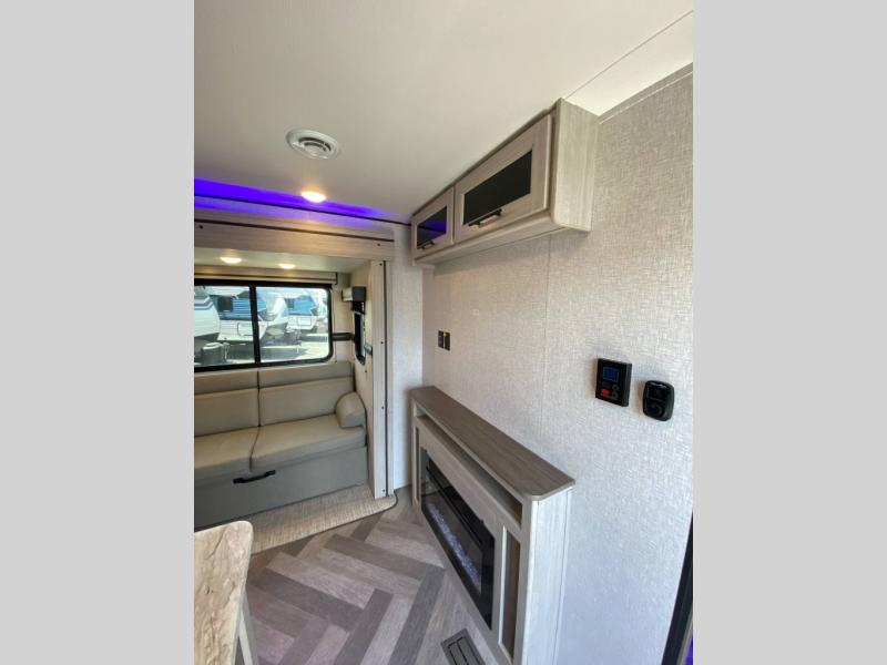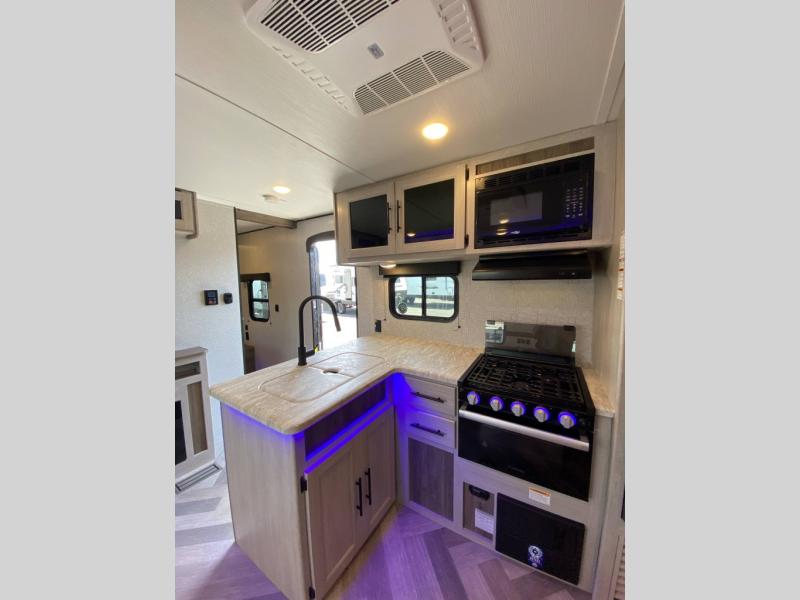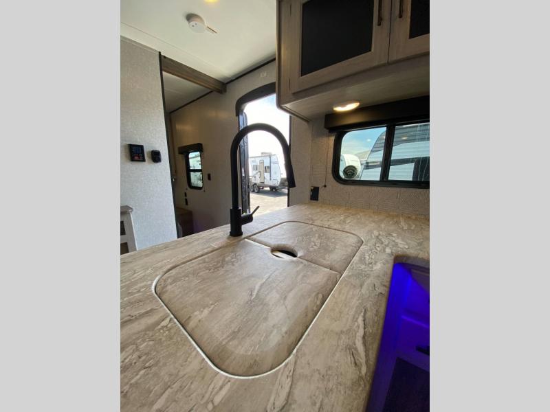 The central living area includes an entertainment center, plenty of storage, and a fully equipped kitchen with a residential-style backsplash, microwave, and large refrigerator. The rear corner bathroom offers easy access from the main living space and bunk area, making it perfect for kids or guests.