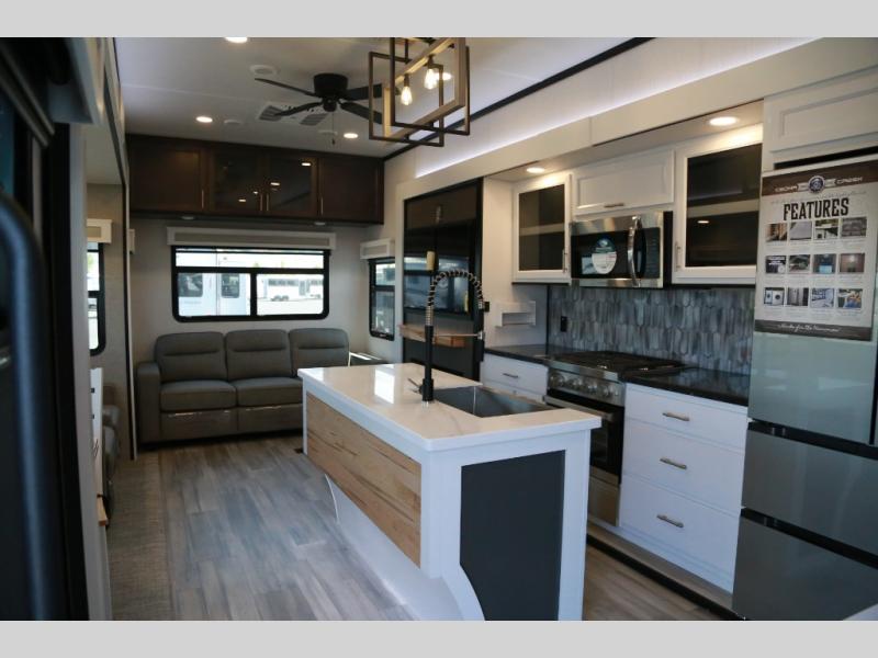Experience true residential comfort in the 2024 Forest River Cedar Creek 360RL, a luxury fifth wheel designed for full-time RV living. This spacious RV features a rear living layout with dual tri-fold sofas, theater seating, and a cozy entertainment center with fireplace. The gourmet kitchen includes a residential refrigerator, center island with farm-style sink, large pantry, and full-size appliances for effortless cooking on the road.
