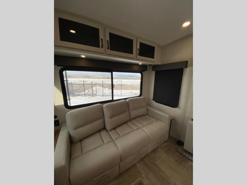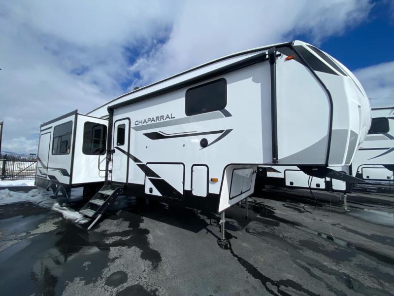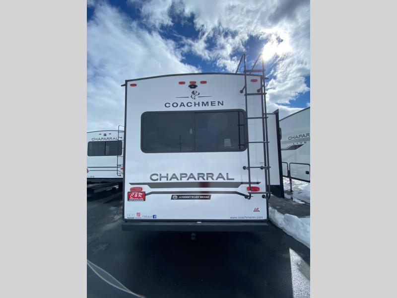 Each Chaparral mid-profile fifth wheel by Coachmen is designed with residential features, loads of storage space, and roomy bedroom suites to make you feel right at home. The durable construction means you can enjoy your RV for years to come. There's 6X double Azdel aluminum cage sidewall system, Weather Shield+ technology, and Tri-Tex powder coated frame technology that will allow you to camp year around. Each model includes a Winegard Air 360+ HDTV/radio dome antenna to help keep you connected as you camp, slow rise blackout roller night shades, a new 16 cu. ft. side-by-side stainless glass 12V refrigerator, and a modern electric fireplace to make your space cozy. There is also a large transom window in the kitchen, a modern high-rise faucet, LED motion sensor lights in the bathroom, plus a full-size shower with glass doors and a seat. Now that's what I call luxury! Choose a Chaparral fifth wheel today!