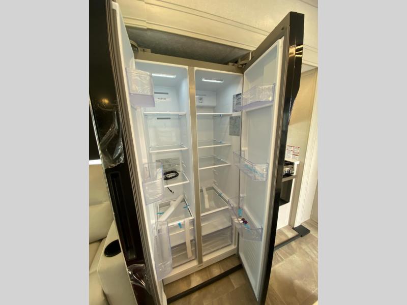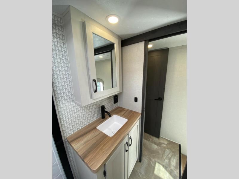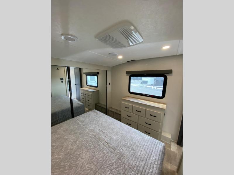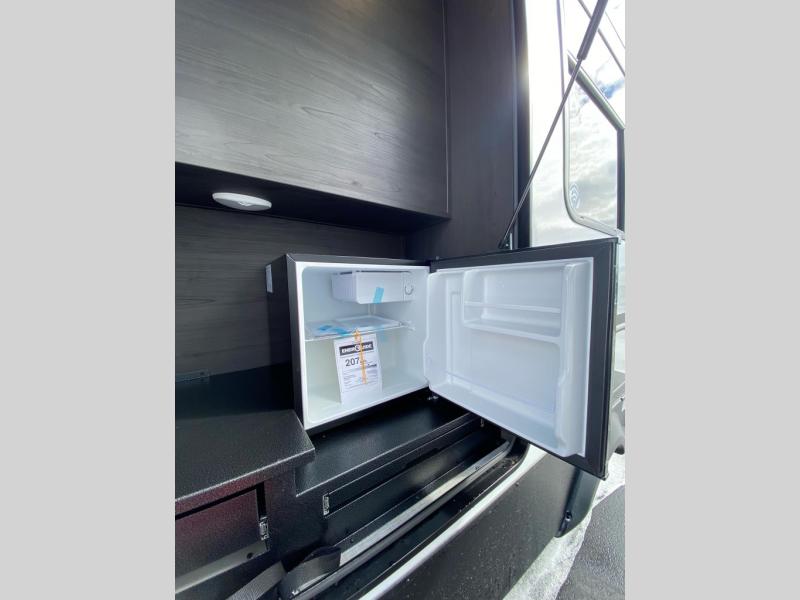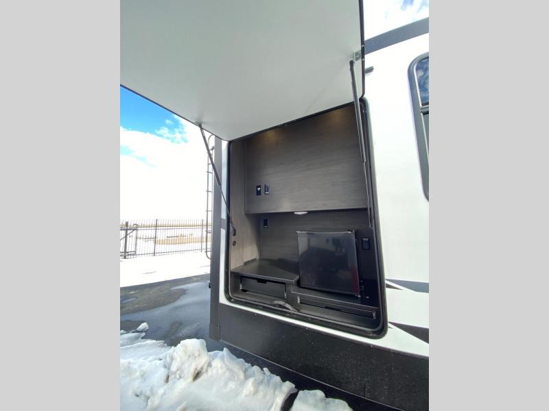 This lightest fifth wheel in the Chaparral line-up will provide hassle-free towing and camping. You will find dual opposing slides in the main living area for tons of space to stretch out, plus a kitchen island that will make this area feel more like home. There is theatre seating across from the entertainment center, and you can enjoy the 50" 4K Smart LED TV for movies. The fully-equipped kitchen includes a GE Profile stainless steel 30" residential microwave, a GE Profile 21" oven with a residential cooktop, and a overhead storage to keep kitchen necessities close by. And don't overlook the front private bedroom with a queen bed, dresser, plus a large wardrobe with washer and dryer prep!