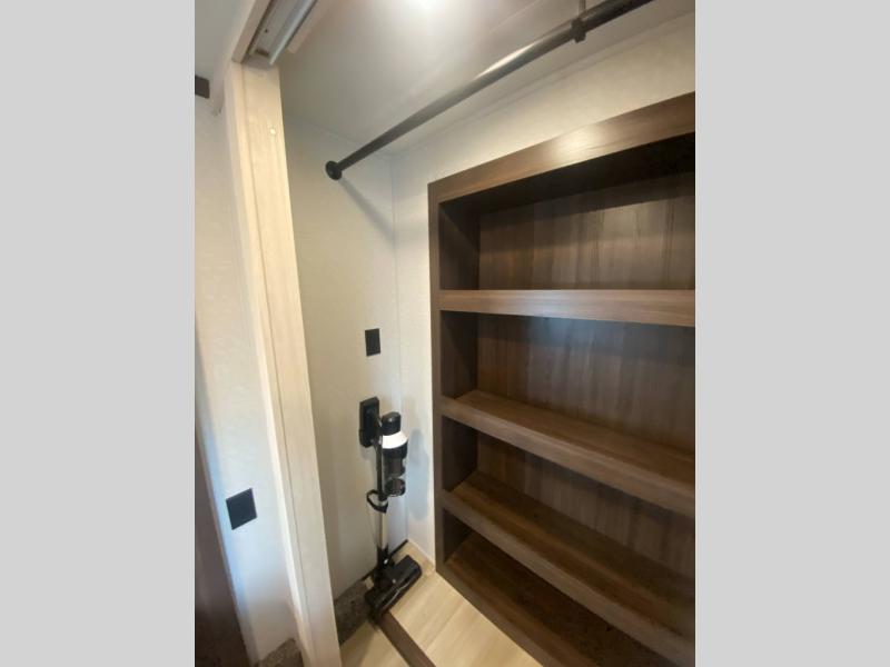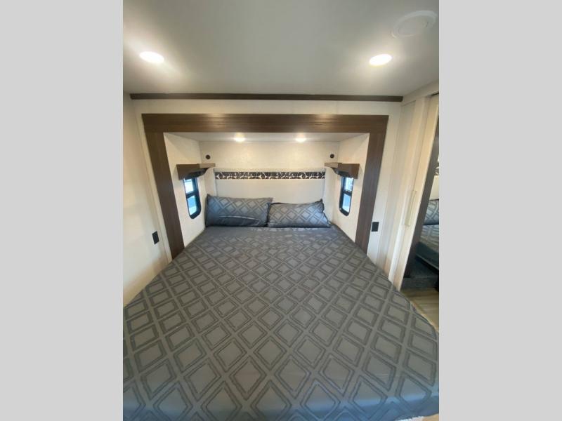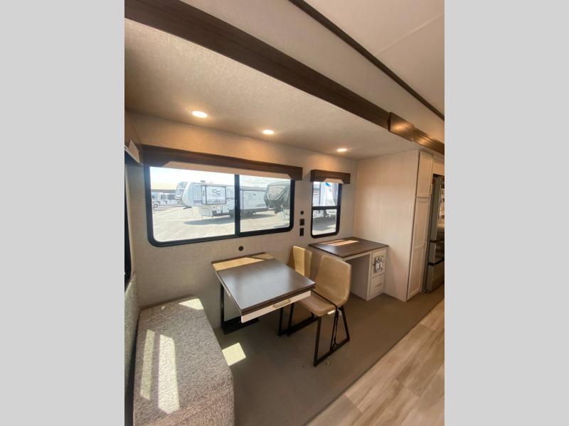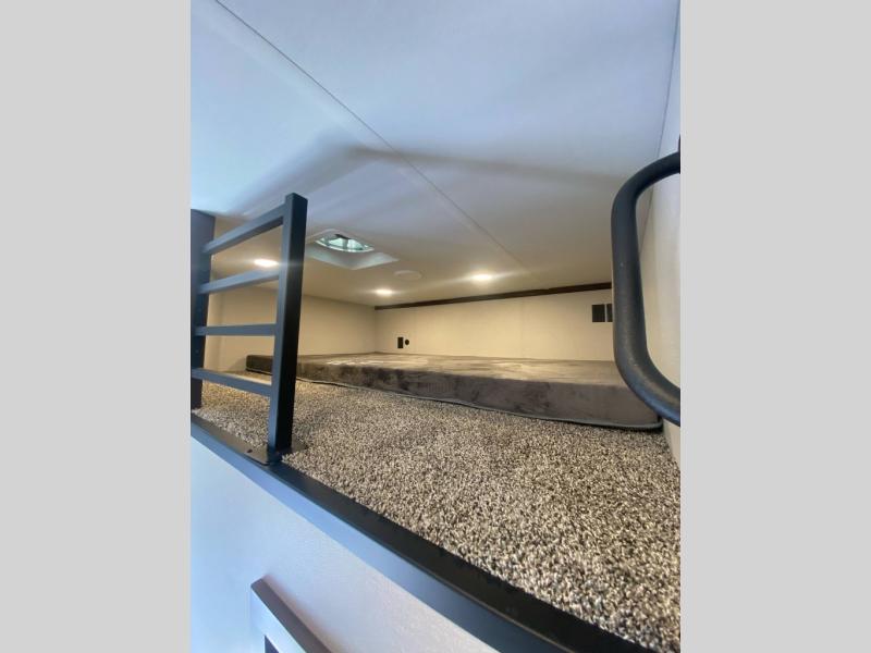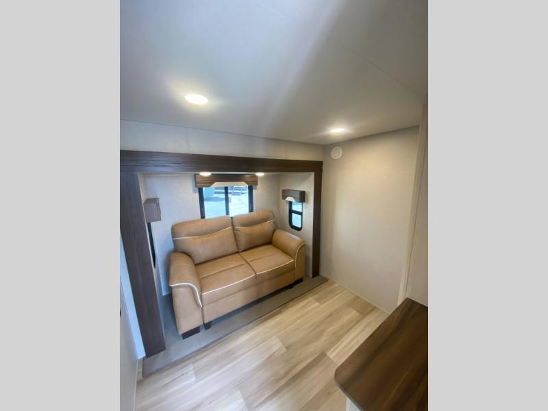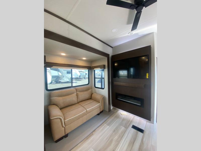 A front kitchen with ample counter space, a middle den, and a front bedroom make this fifth wheel one to remember! The living area will be a favorite spot to visit together since there is a hide-a-bed sofa and theater seating, plus an entertainment center with a fireplace. There is also a free-standing dining table and a desk with a chair if you need to telecommute. Your guests will love the middle den with a hide-a-bed sofa and a closet for their things, plus there is a loft above this room for added sleeping or storage space. A spacious full bath includes a shower with a seat, and the king bed slide out in the front private bedroom is sure to bring a great night's rest.