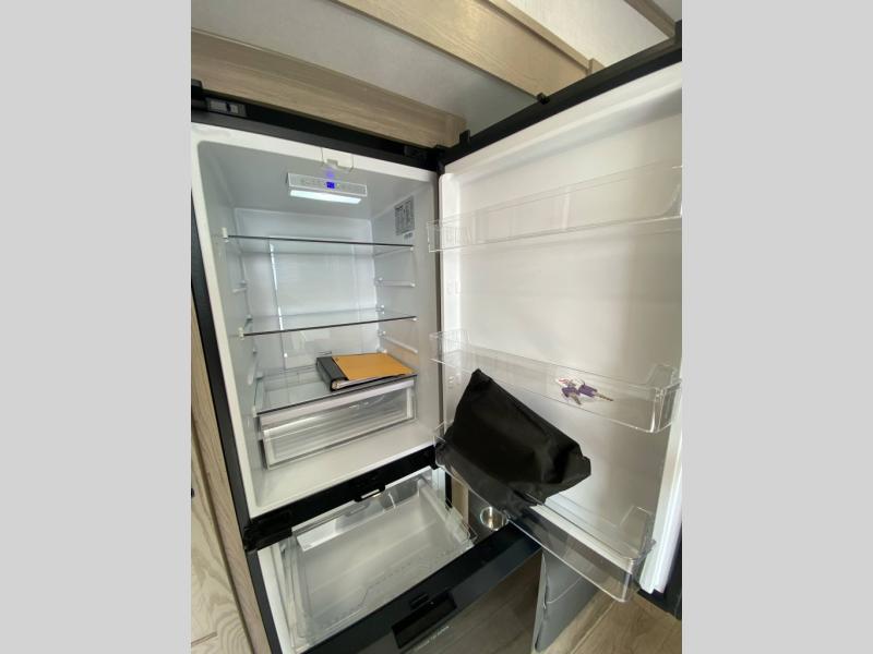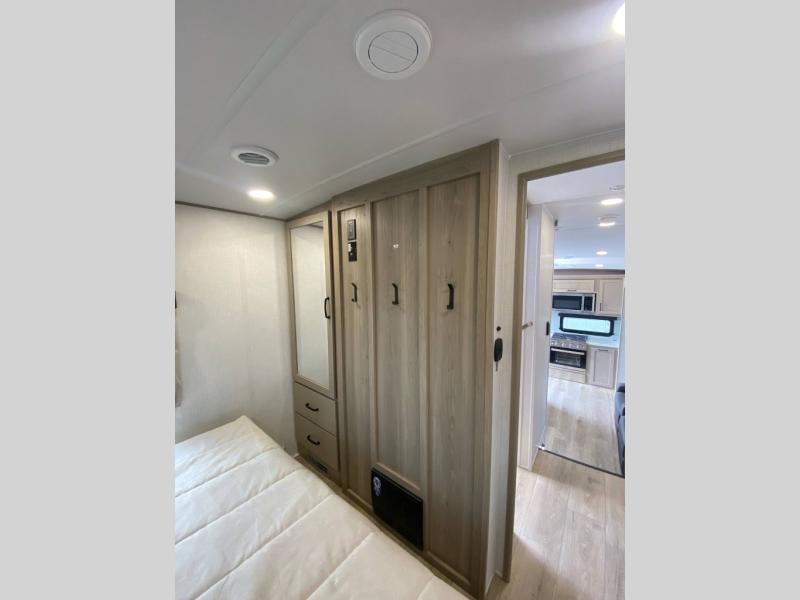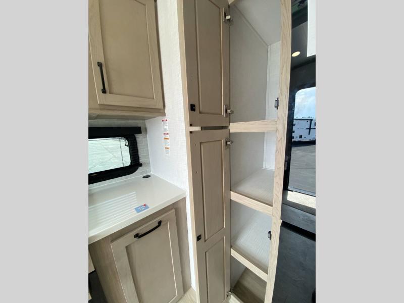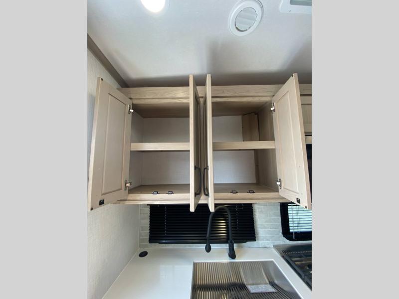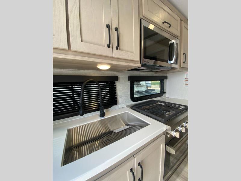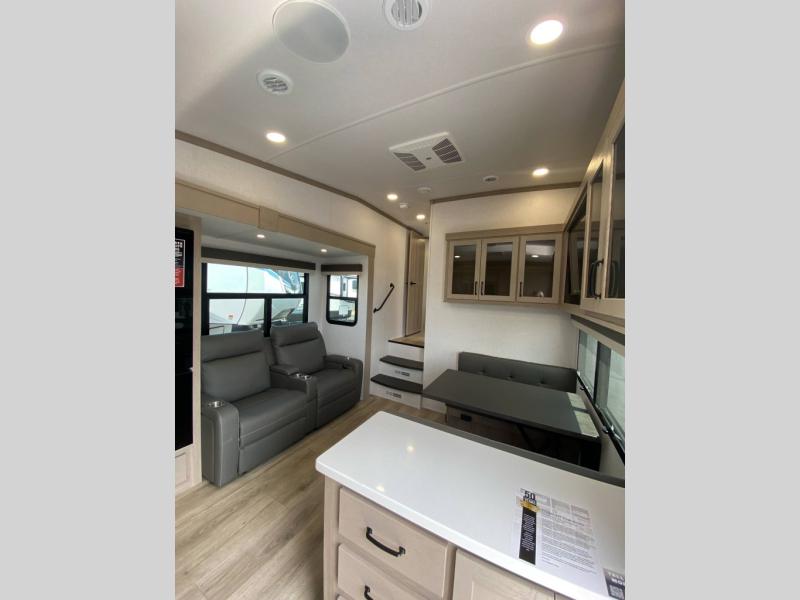 This rear kitchen fifth wheel is the perfect couple's trailer with space for an overnight guest on the booth dinette. There is a front private bedroom with a queen bed where you'll get a great night's rest, and in the morning you can relax on the theater seat with your coffee. The chef of your group will appreciate ample counter space to prep meals, and if the weather is nice, you might want to take your plate outdoors to eat under the 20' power awning.